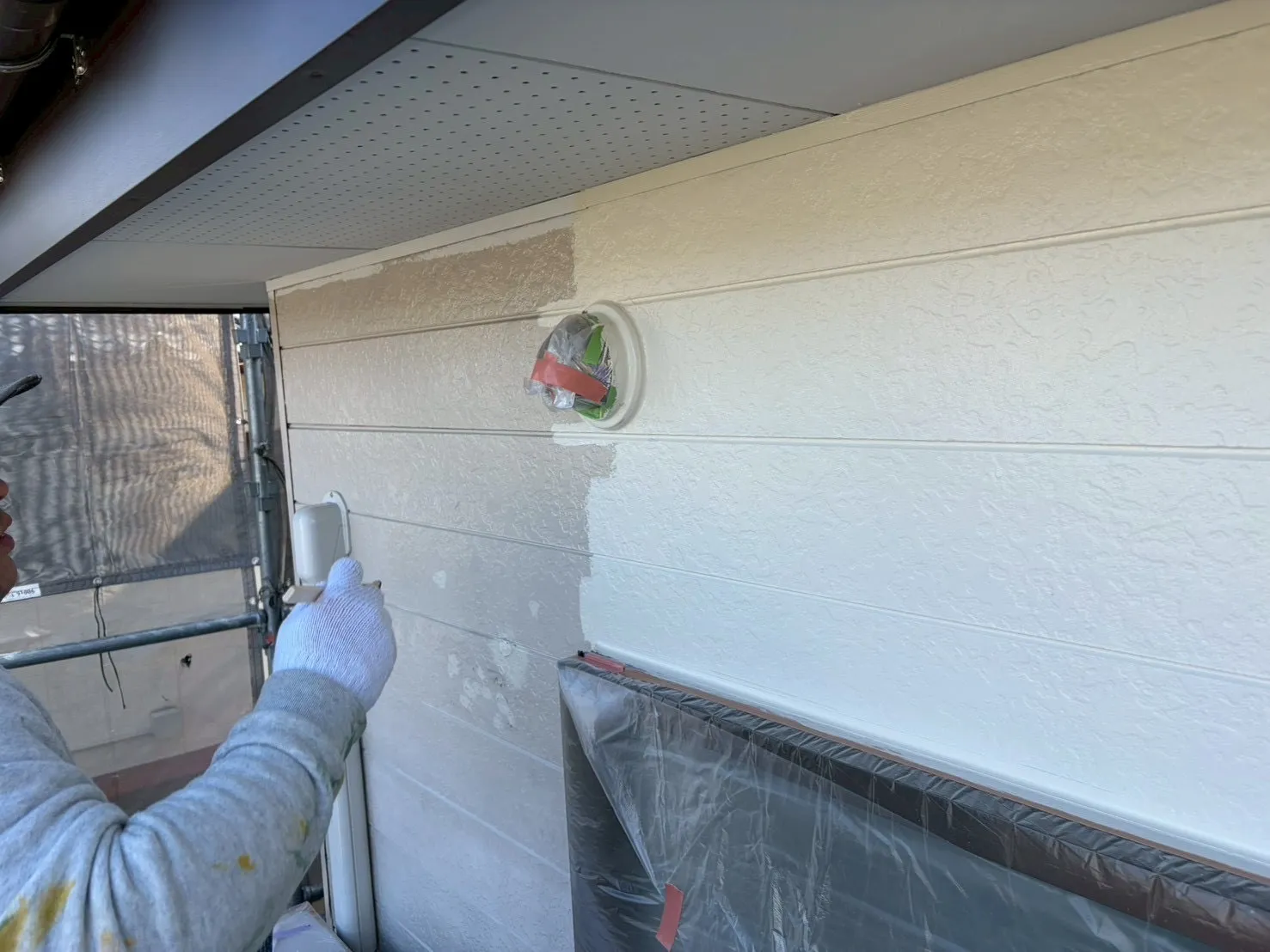 塗装に入る前に、塗料が付いてはいけない窓、サッシ、床、給湯器、室外機などをビニールシートやマスキングテープで覆い保護を行います。