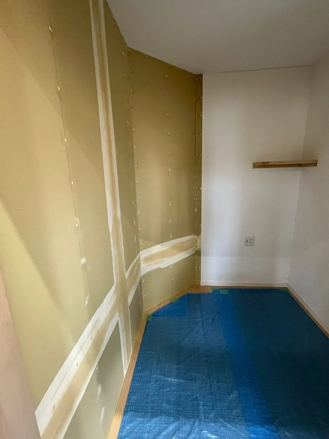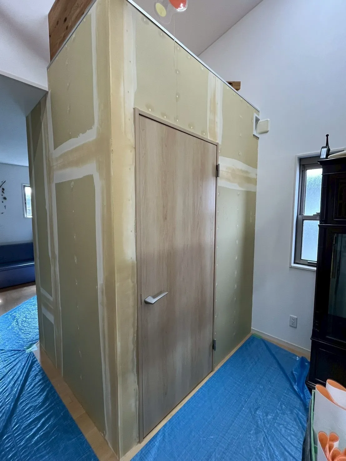 骨組みの上から「プラスターボード」という壁材を隙間なく貼り込み、部屋の形を作っていきます。同時に、新しい小部屋の入り口となる室内ドア(建具)も設置。これで、施設内の広いスペースから独立した「ひとつの部屋」としての輪郭が完全に見えてきました。壁紙(クロス)を貼る前の最も重要なステップが、この「パテ処理」です。ボードの継ぎ目やビスの跡にパテを塗り込み、壁面を真っ平らに整えていきます。