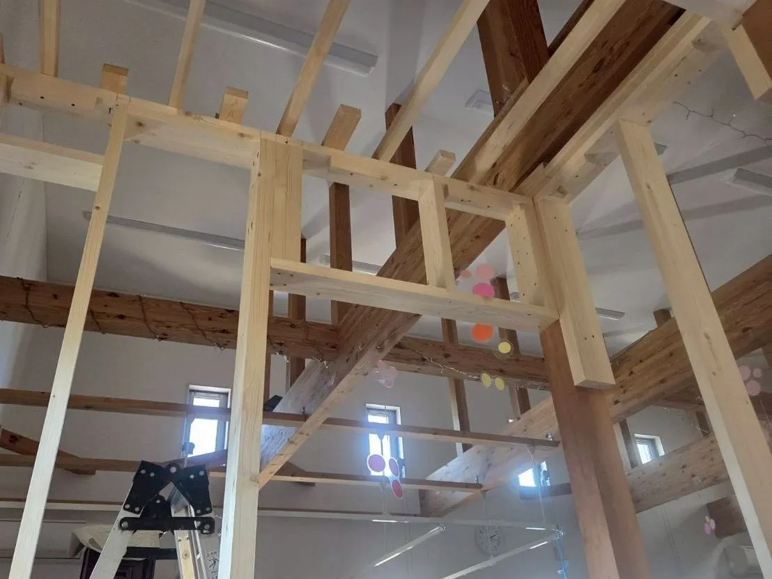 お子様が利用する施設のため、壁の強度は非常に重要です。垂直・水平をミリ単位で計測し、頑丈な骨組みを構築しました。この骨組みが、後の建具(ドア)のスムーズな開閉や、壁の直進性を支える文字通りの「要」となります。