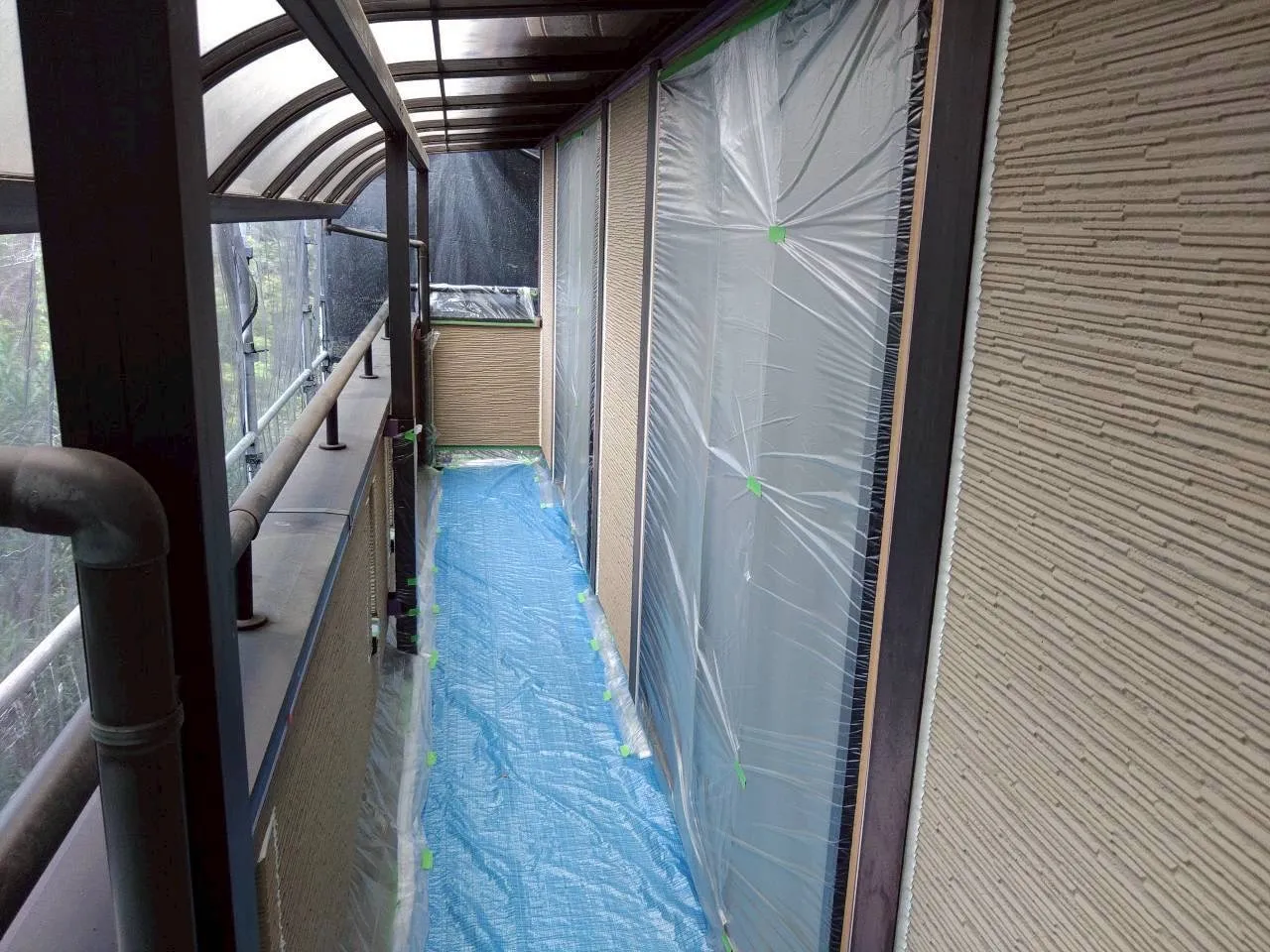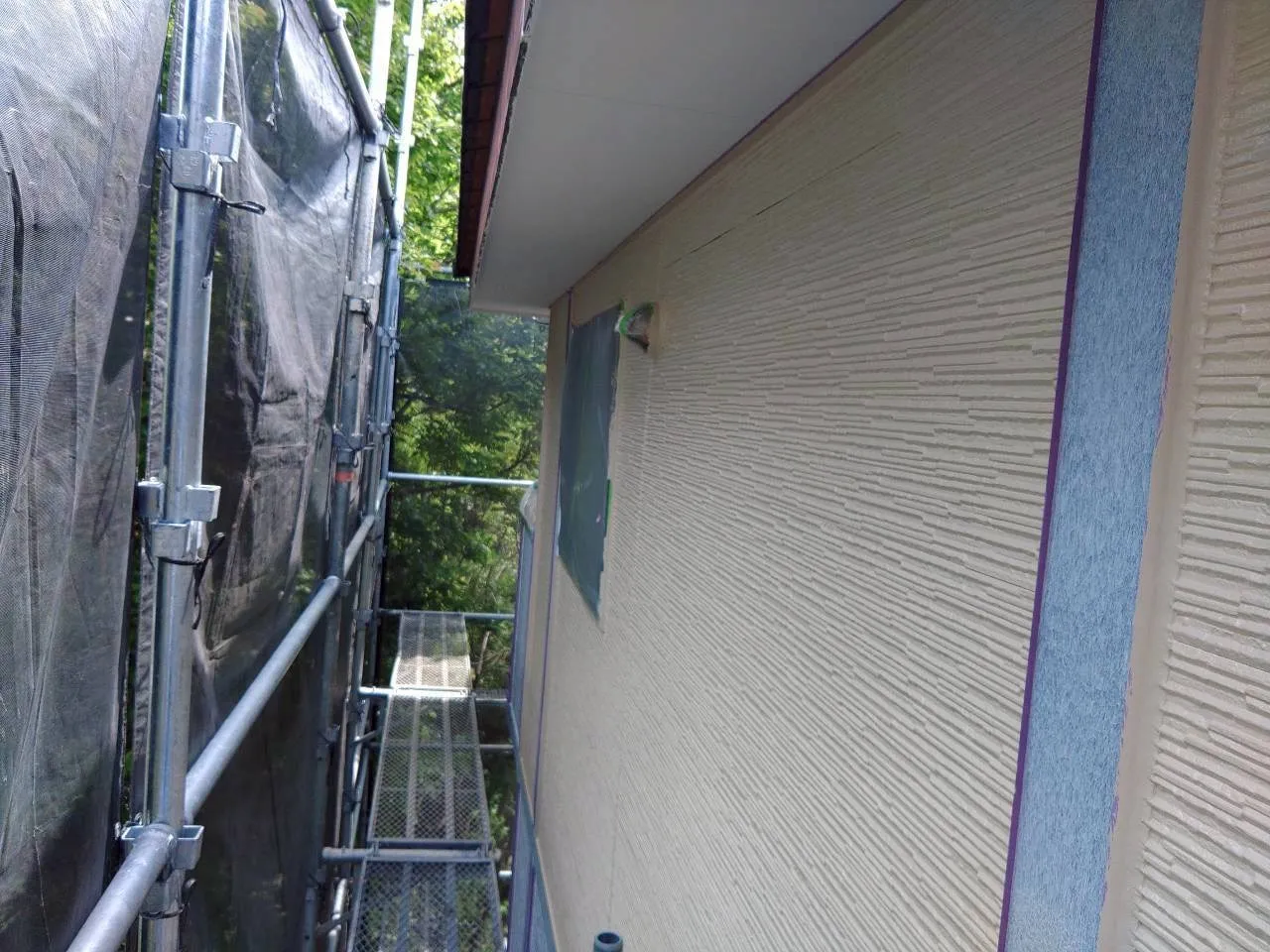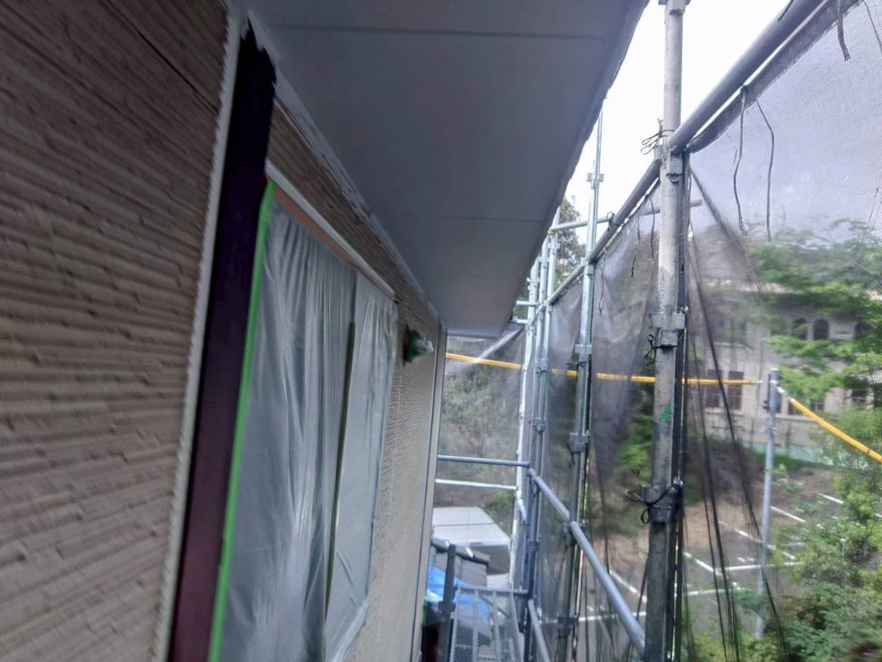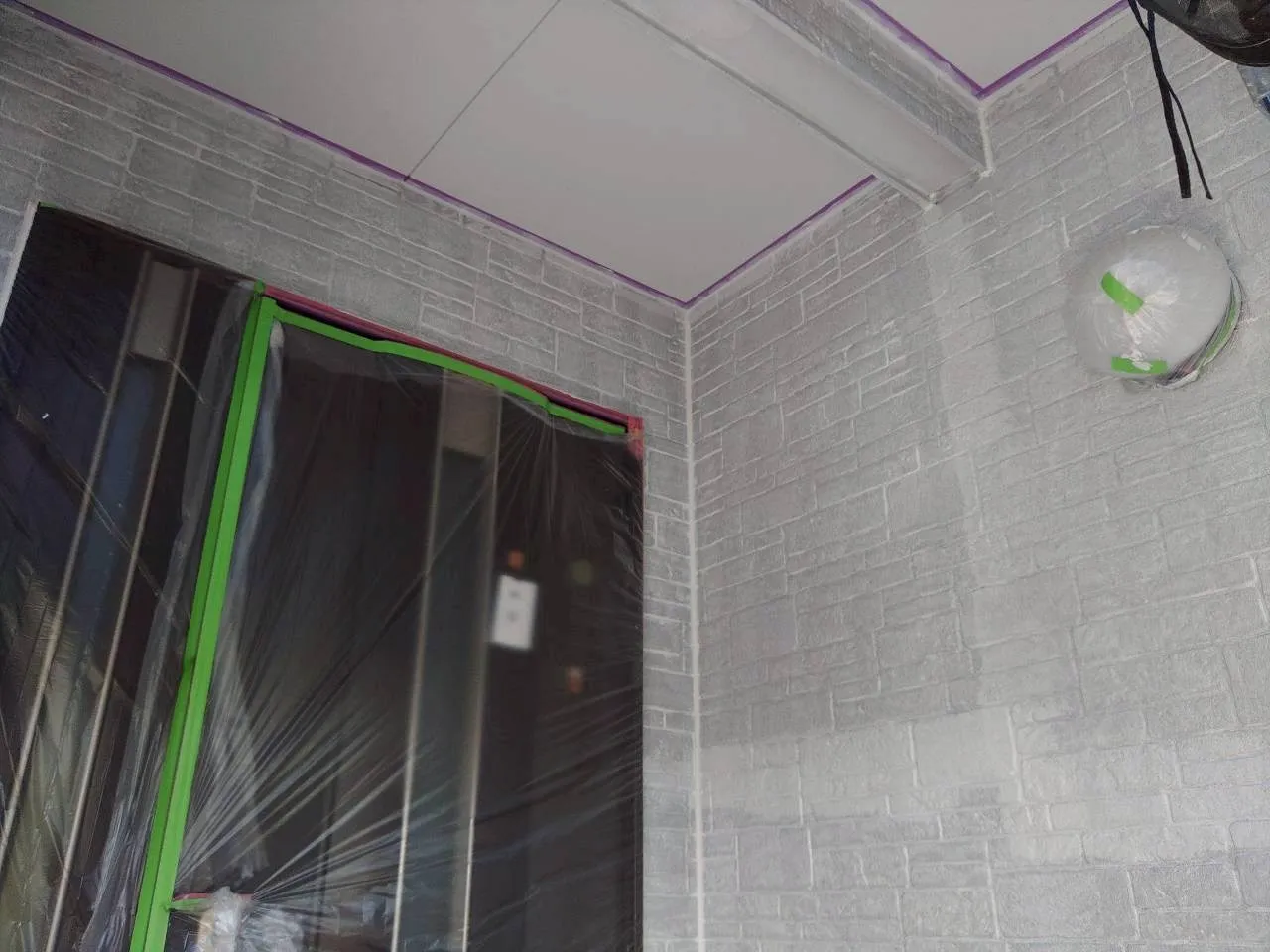 高圧洗浄で汚れを落とした後、塗装工程に入る前に行うのが、窓や床、アルミサッシなどをビニールで保護する「養生(ようじょう)」です。 「養生の質を見れば職人の腕がわかる」と言われるほど、塗装の「見切り(境界線)」を真っ直ぐ出すためには欠かせない準備作業です。塗料の飛散から住まいの資産価値を守るだけでなく、工事中もお客様がなるべく不自由を感じないよう、開閉が必要な窓への配慮や足元の安全確保を徹底して進めていきます。