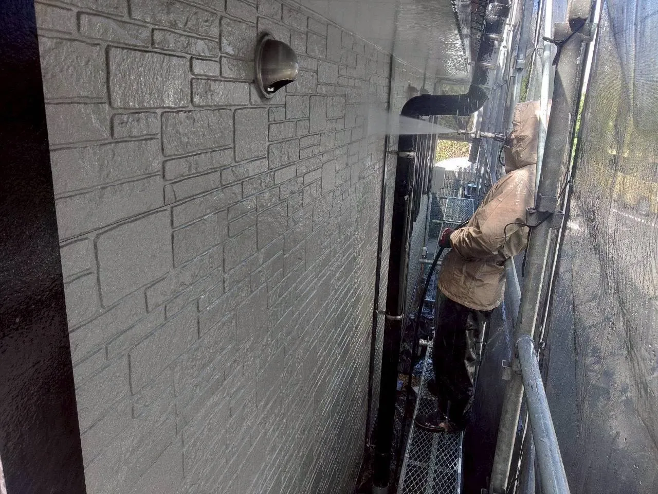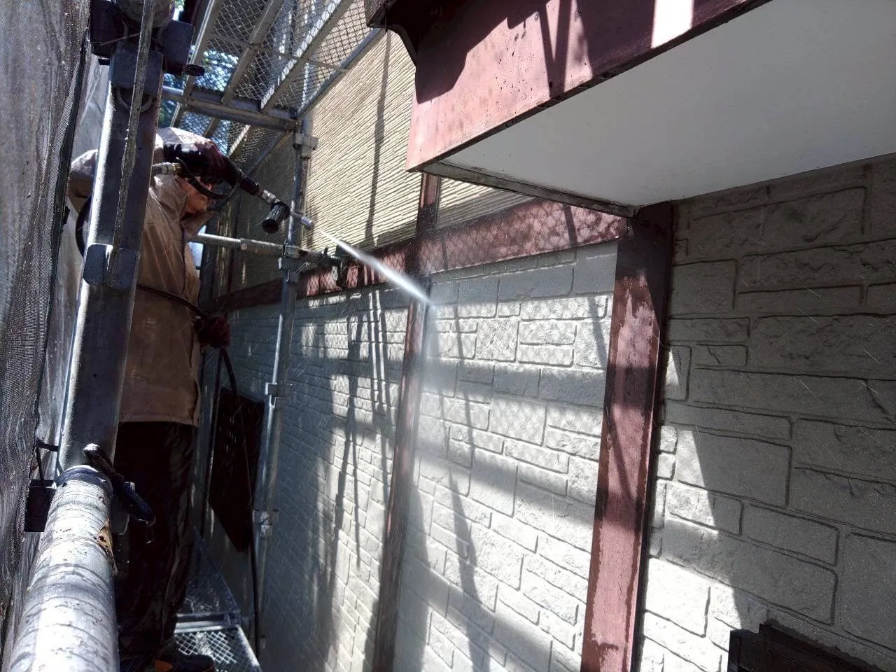 外壁塗装の仕上がりを左右する最初の重要工程が、この「高圧洗浄」です。どんなに高級な塗料を使用しても、下地にコケや古い汚れが残ったままでは、数年で剥がれや膨れの原因となってしまいます。Plus-Aでは、一級塗装技能士の管理のもと、外壁の素材を傷めない最適な水圧を調整。工期スケジュールを遵守しつつ、隅々まで徹底的に洗い流すことで、新築時のときのような「塗装に最適な素地」へと蘇らせます。