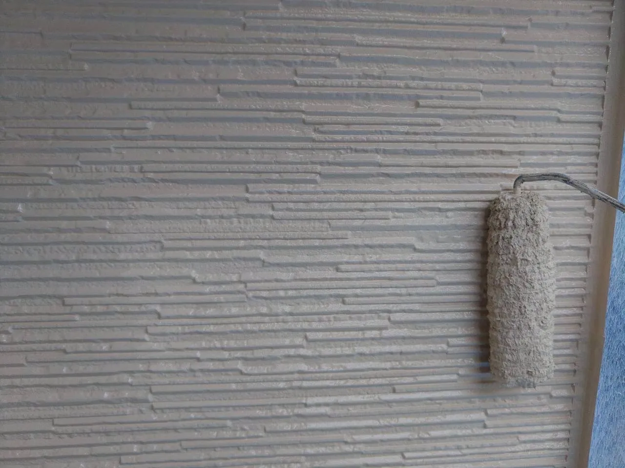 高圧洗浄と養生が完了し、いよいよ塗装のメイン工程へと移ります。外壁塗装は、ただ色を塗るだけではありません。下地と塗料を密着させる「下塗り」、厚みを持たせて色を出す「中塗り」、そして耐久性と美観を完成させる「上塗り(仕上げ)」の計3回塗りが基本です。今回採用した「エスケープレミアムシリコン」は、紫外線や雨風による劣化を抑えるラジカル制御形塗料です。これを一級職人がローラーと刷毛を使い分け、塗り残しがないよう丁寧に手塗りで仕上げていきます。