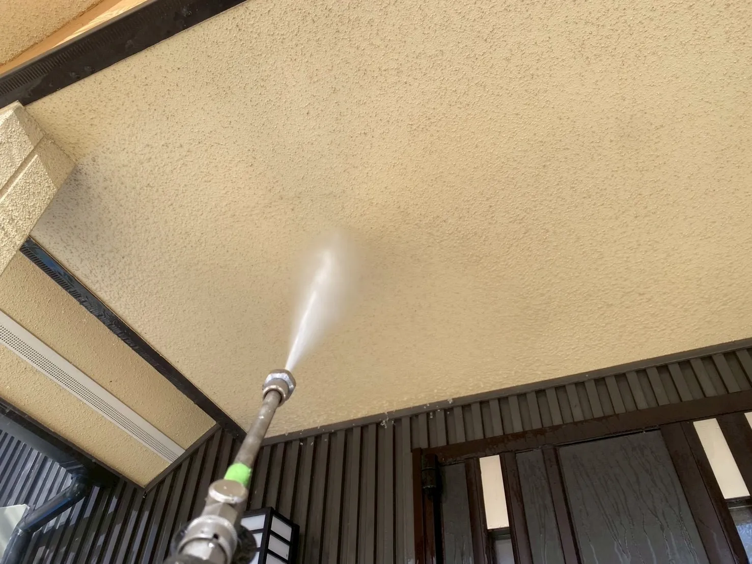 見た目がきれいになっていても、旧塗膜のチョーキング(白い粉)や細かな汚れが残っていると、塗料がしっかり密着しません。高圧洗浄は見える部分だけでなく、素材の奥までしっかり除去できているかが重要です。