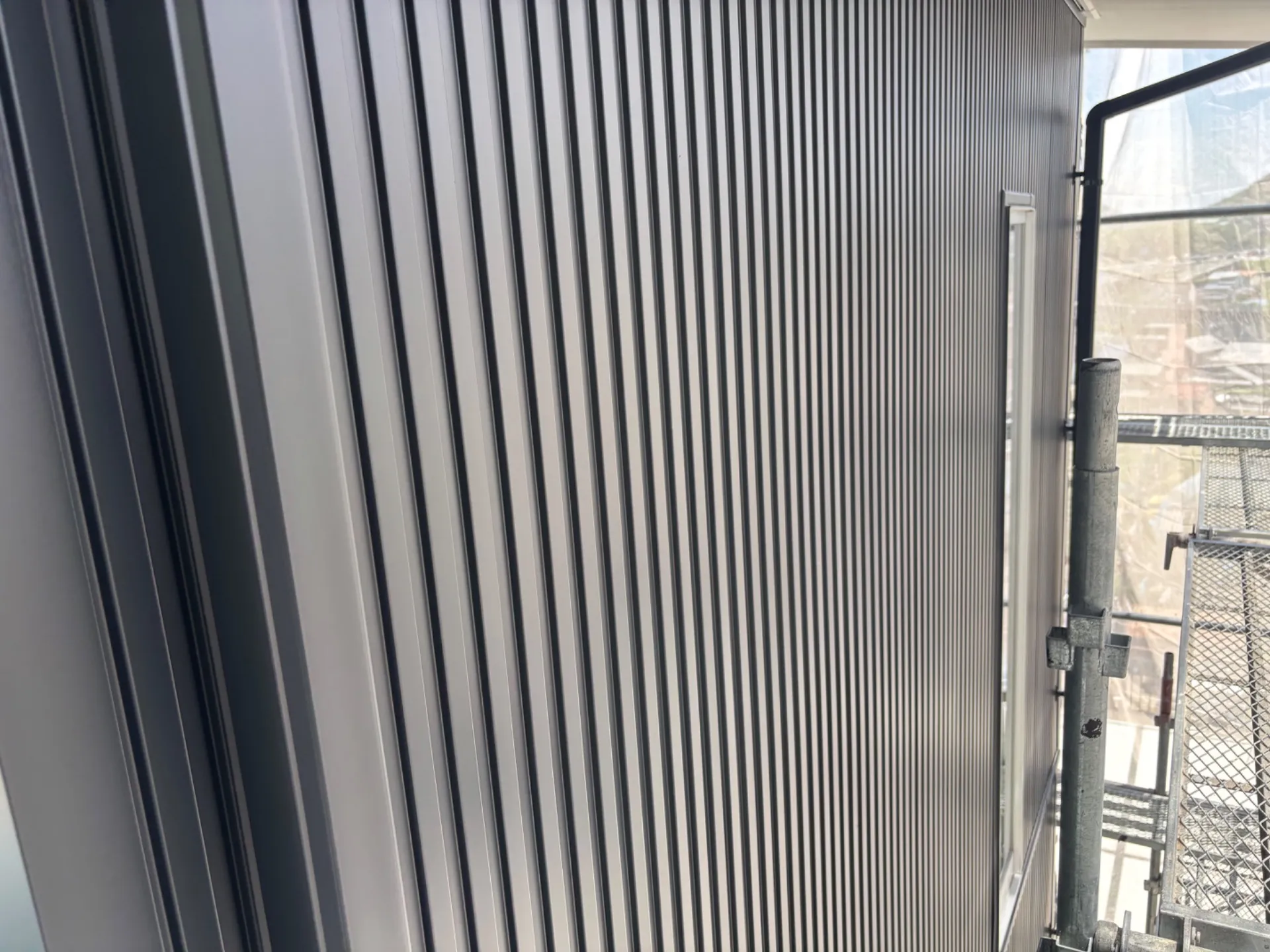 お疲れ様です。岐阜市にて外壁塗装塗り替え現場です。ガルバニウム鋼板の塗り替えは久々です!下塗りと中塗りが終わり今日は上塗りの吹付でした!完成がこちら^_^新品のガルバに元通りです。カラーはN-20…