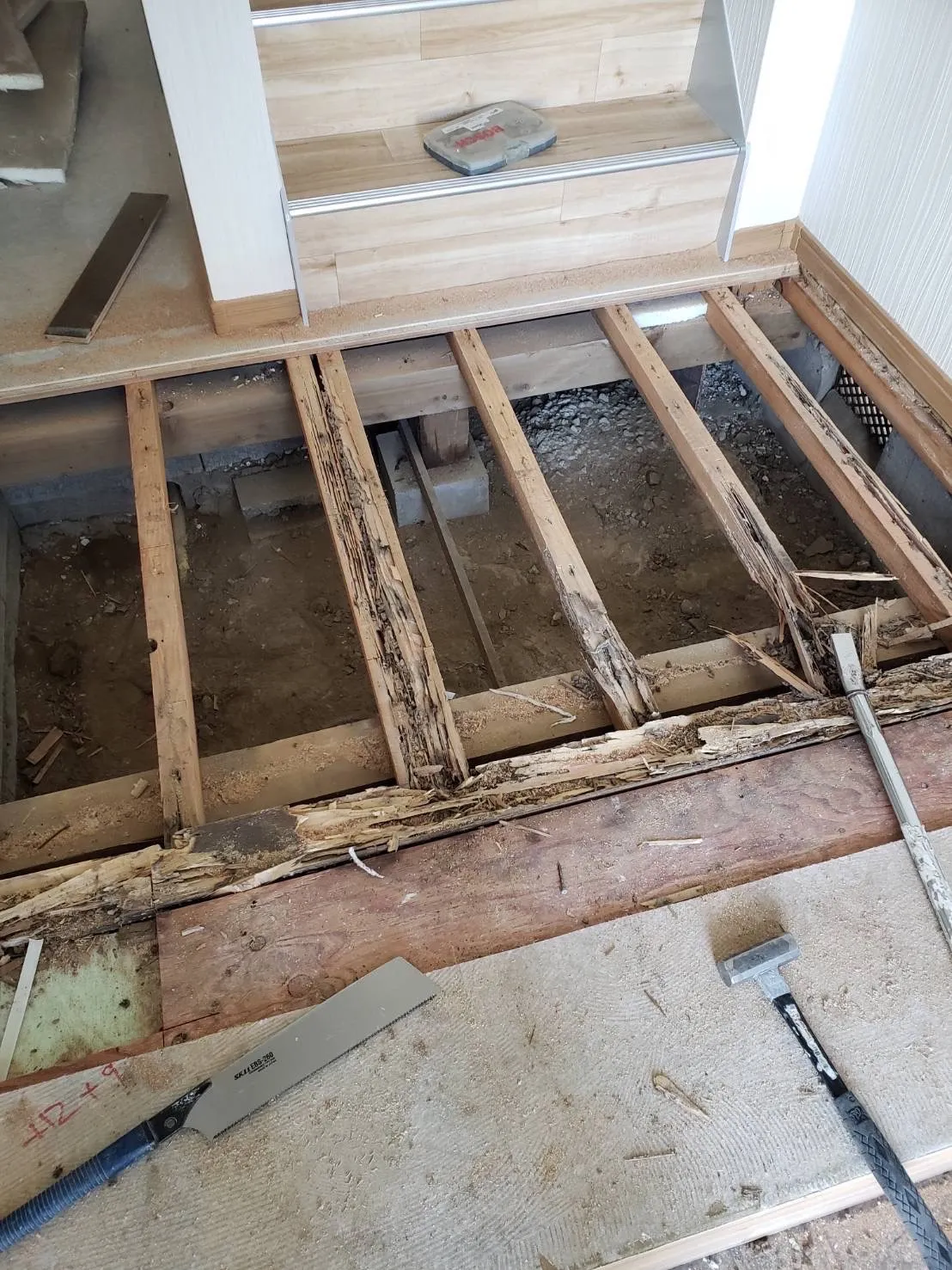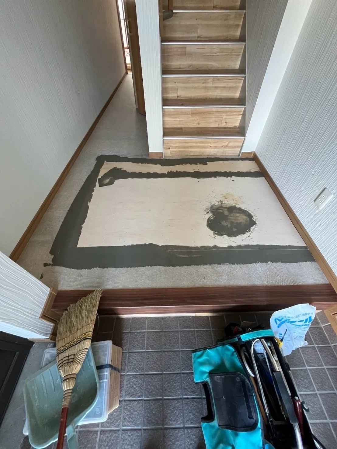 お疲れ様です。岐阜市長良にて外壁塗装防水工事です。内装工事の昨日の続きです。パテをかいクッションフロアーをひきました。同じ柄があってピッタリ合いました^_^良かったです!完成!外部は軒天塗装が…